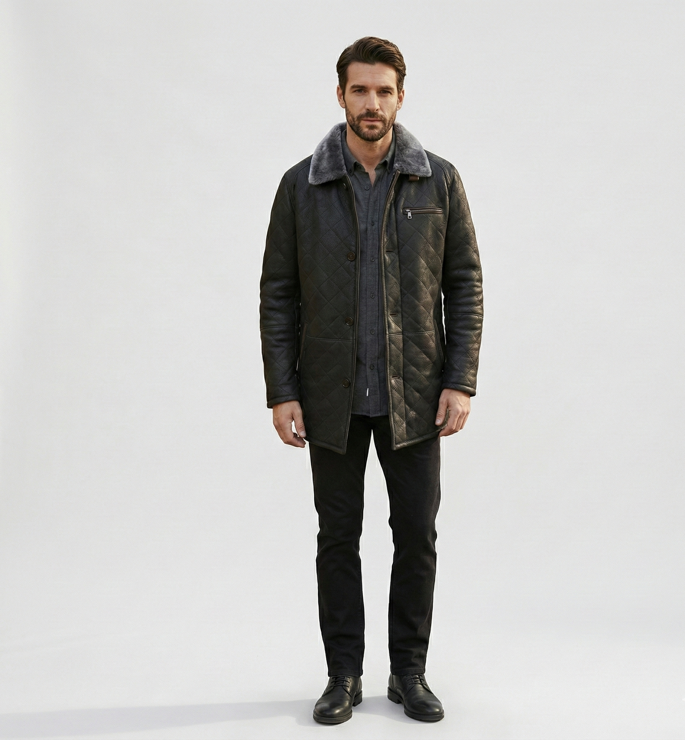 this men’s quilted shearling collar jacket blends classic design with modern practicality. The quilted outer shell provides structured warmth and visual depth, while the soft shearling-style collar delivers added comfort and insulation around the neck..