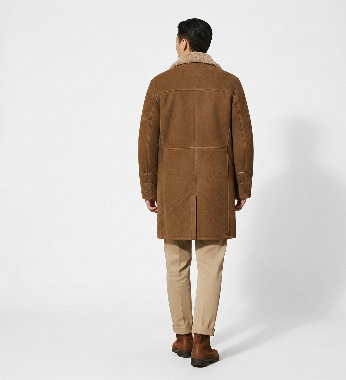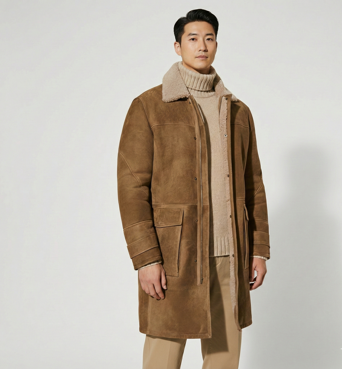Men’s Suede Shearling Coat – Zip-Front Wool Lined Jacket
