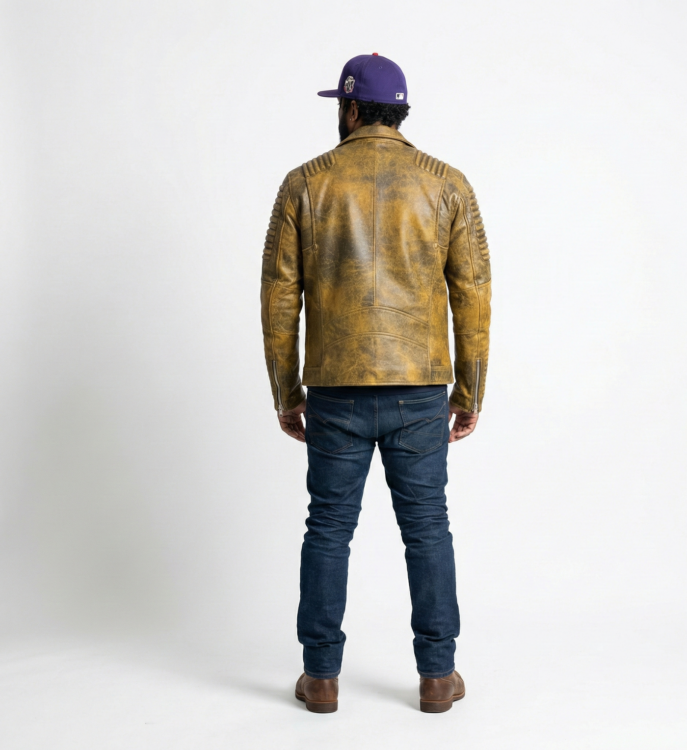 Crafted with a heavily distressed leather look, the jacket features signature moto details including ribbed shoulder and sleeve panels, asymmetrical zip accents, and a structured lapel collar. The tailored fit enhances your frame while maintaining comfort and mobility—perfect for streetwear, nightlife, or standout casual looks.