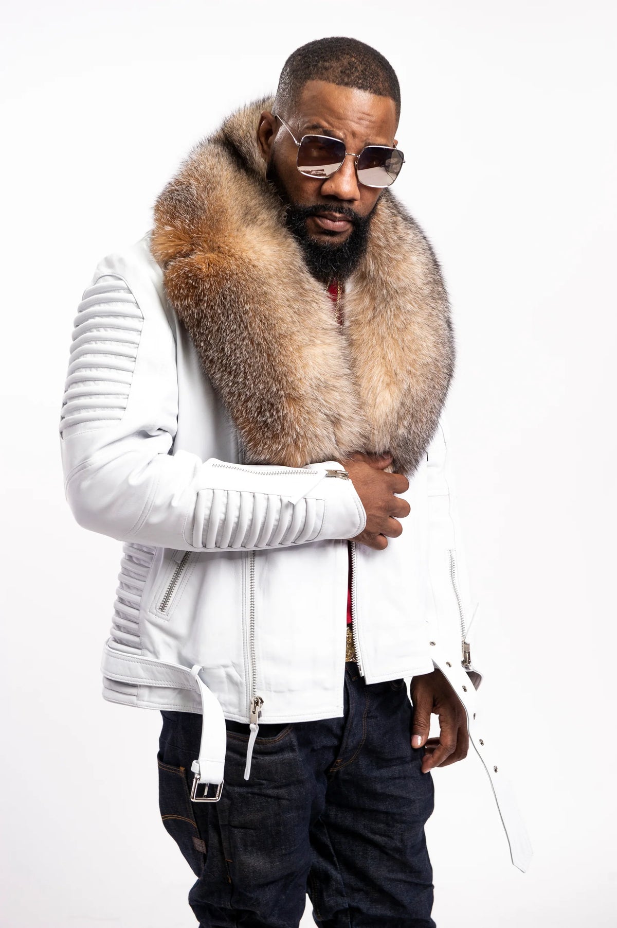 Men's Trey Biker With Fur Collar Leather Jacket [White] - XS