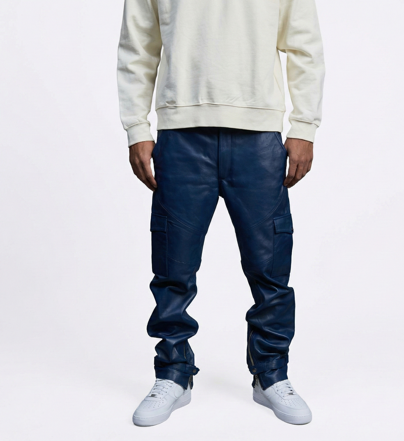 Men’s Blue Leather Cargo Pants with Side Pockets