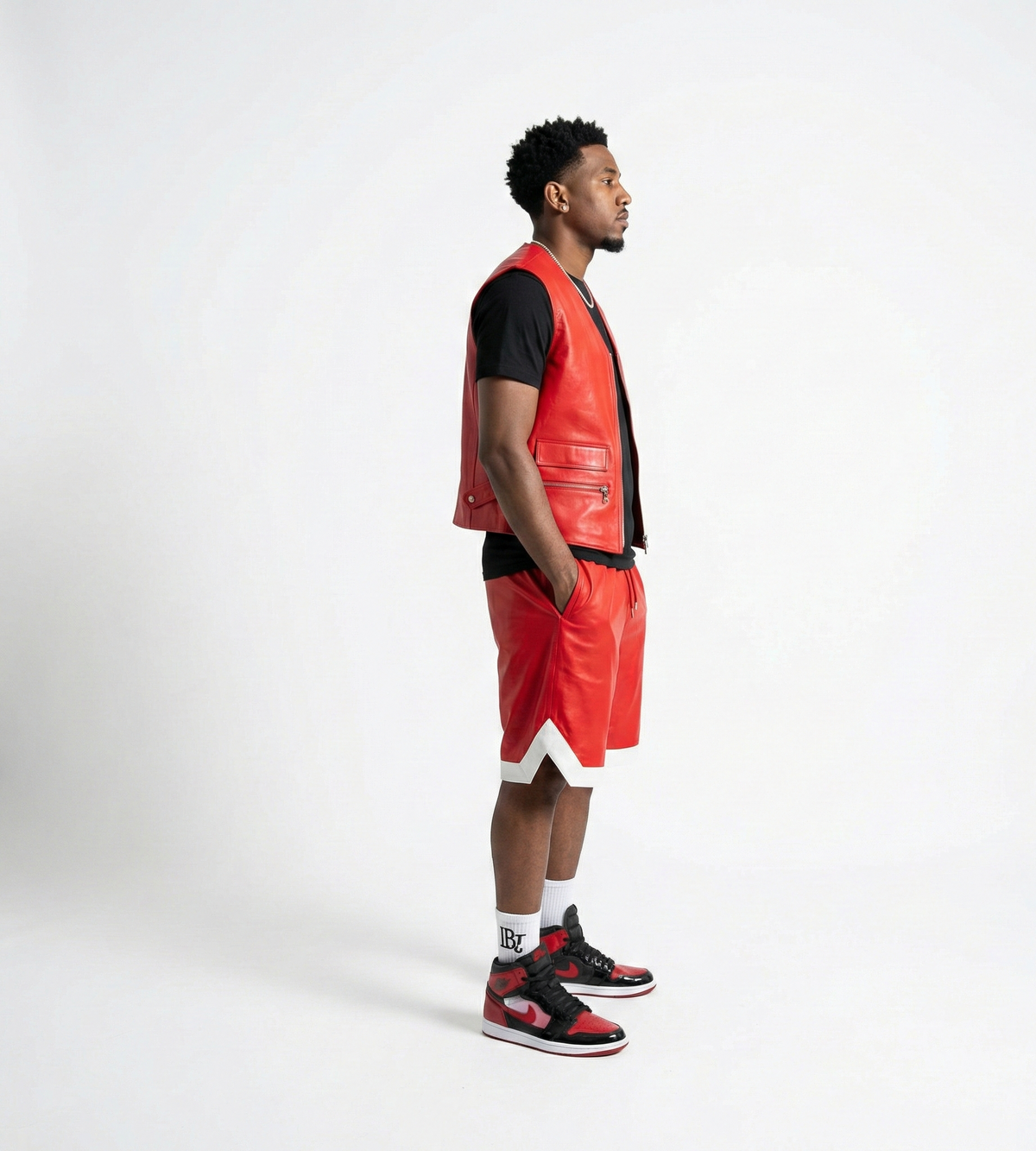 Complete the look with a matching red leather vest or shirt for a head-turning set, or keep it simple with a black tank and high-top sneakers for effortless streetwear appeal.