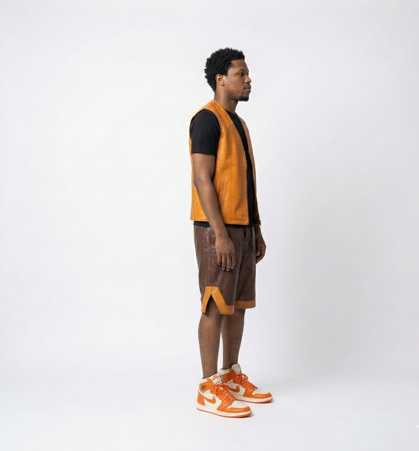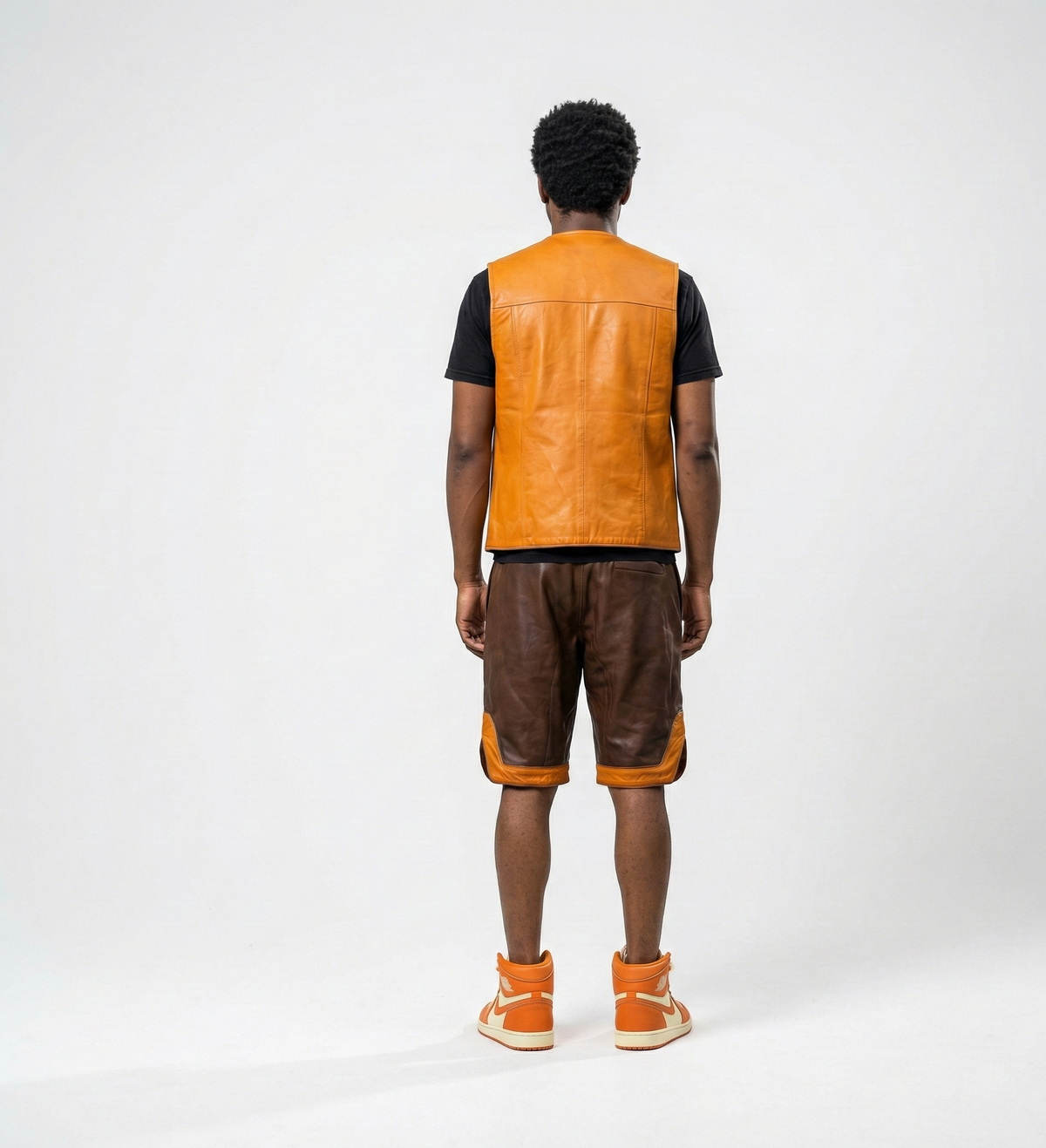 Men’s Premium Leather Shorts, designed to deliver bold style, comfort, and versatility. Crafted from high-quality genuine leather, these shorts feature a rich brown tone with contrasting trim for a clean, elevated streetwear look.