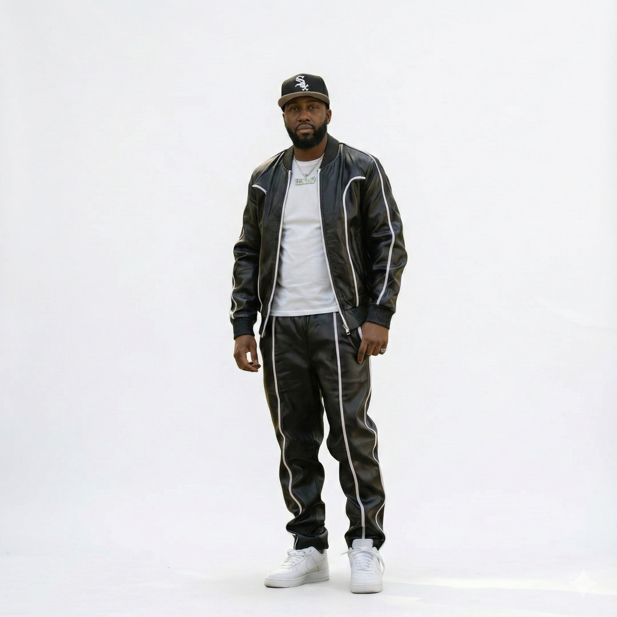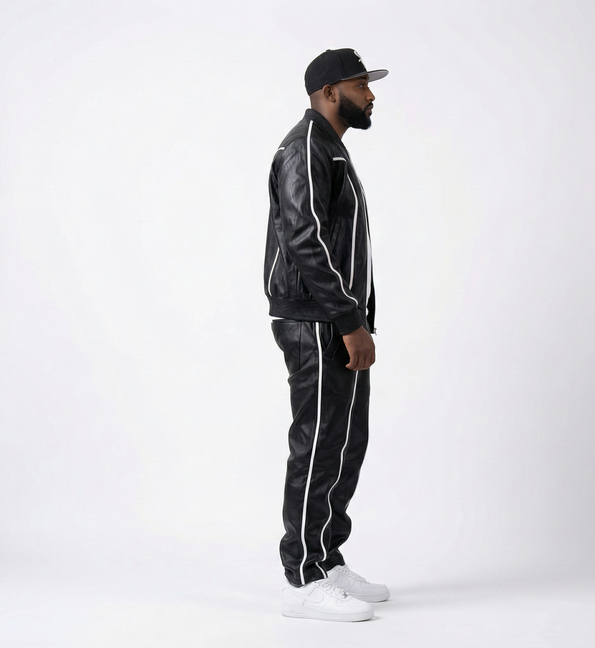 men’s black leather jacket and jogger set, designed for bold streetwear style with a clean, athletic edge. Featuring sleek contrast piping and a tailored silhouette, this matching two-piece delivers a modern look that’s both confident and versatile.