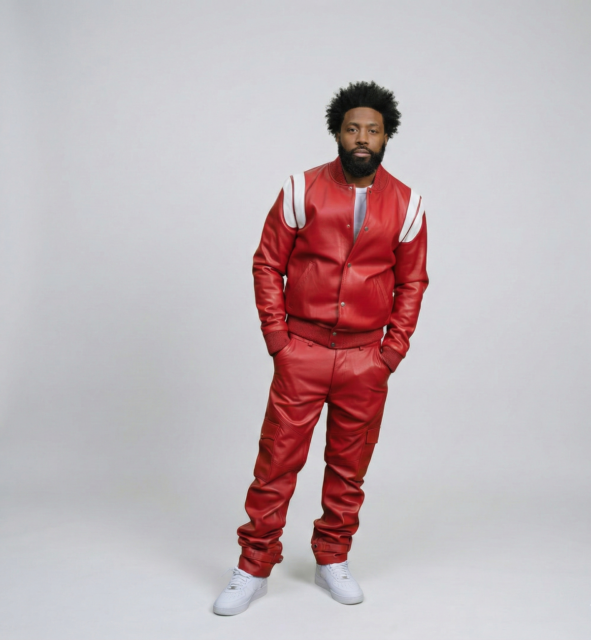Men’s Red Leather Jacket & Cargo Pants Set – Premium Two-Piece Moto Style Streetwear Outfit with Utility Pockets