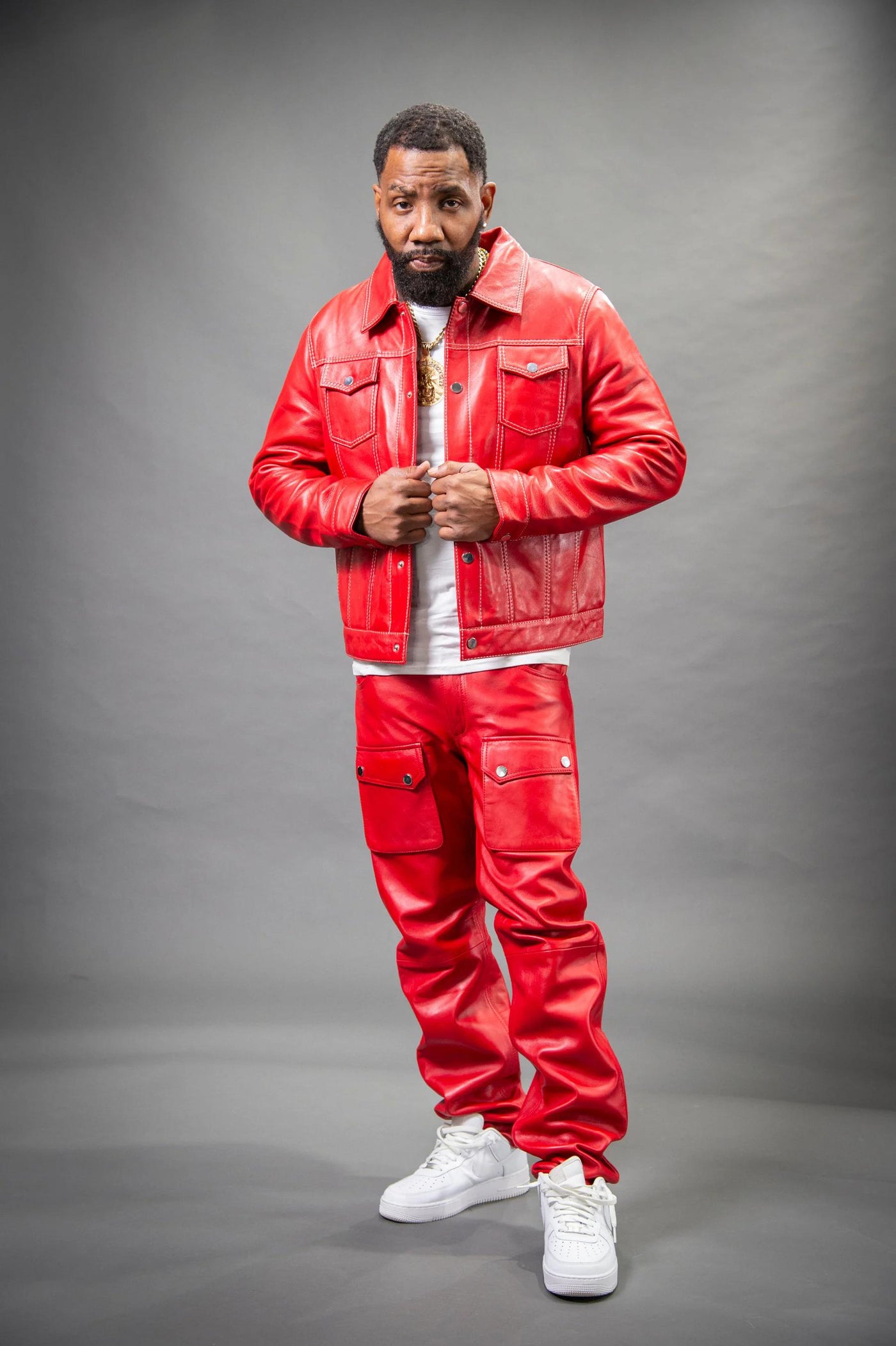 Men's Safari Leather Jacket And Cargo Pants Set [Red]