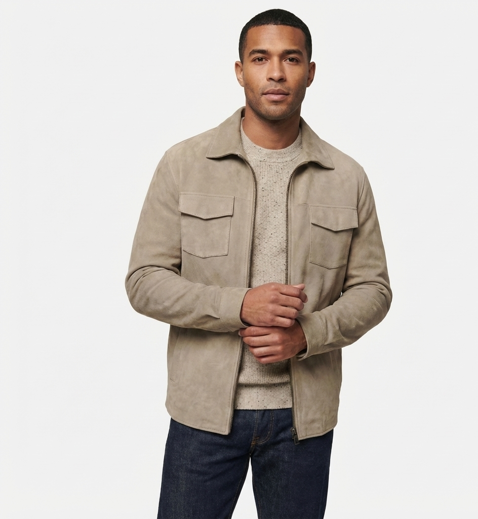 Men’s Suede Utility Jacket – Modern Fit with Zip Closure