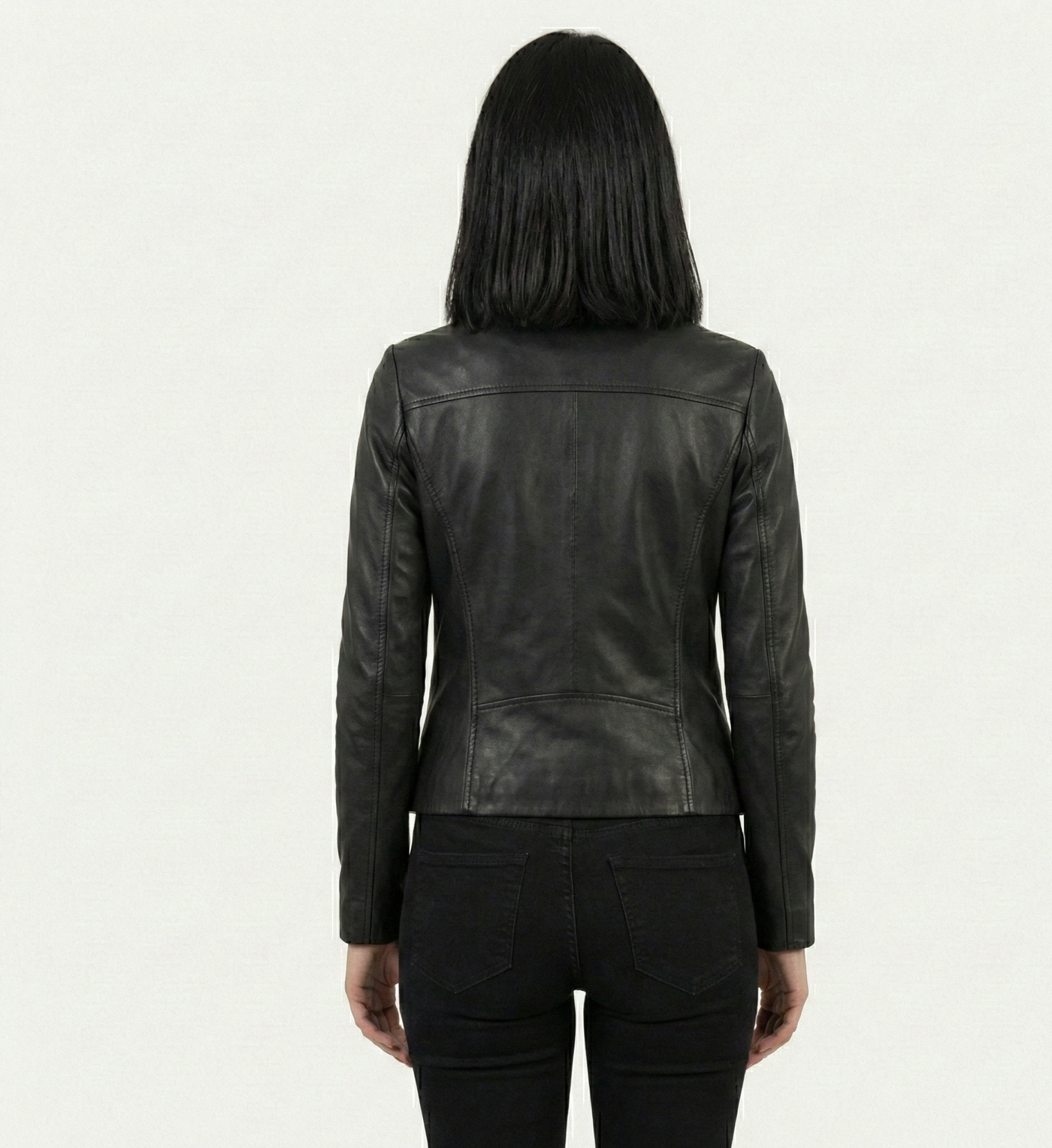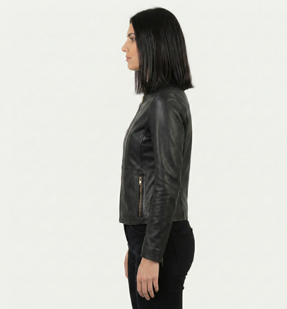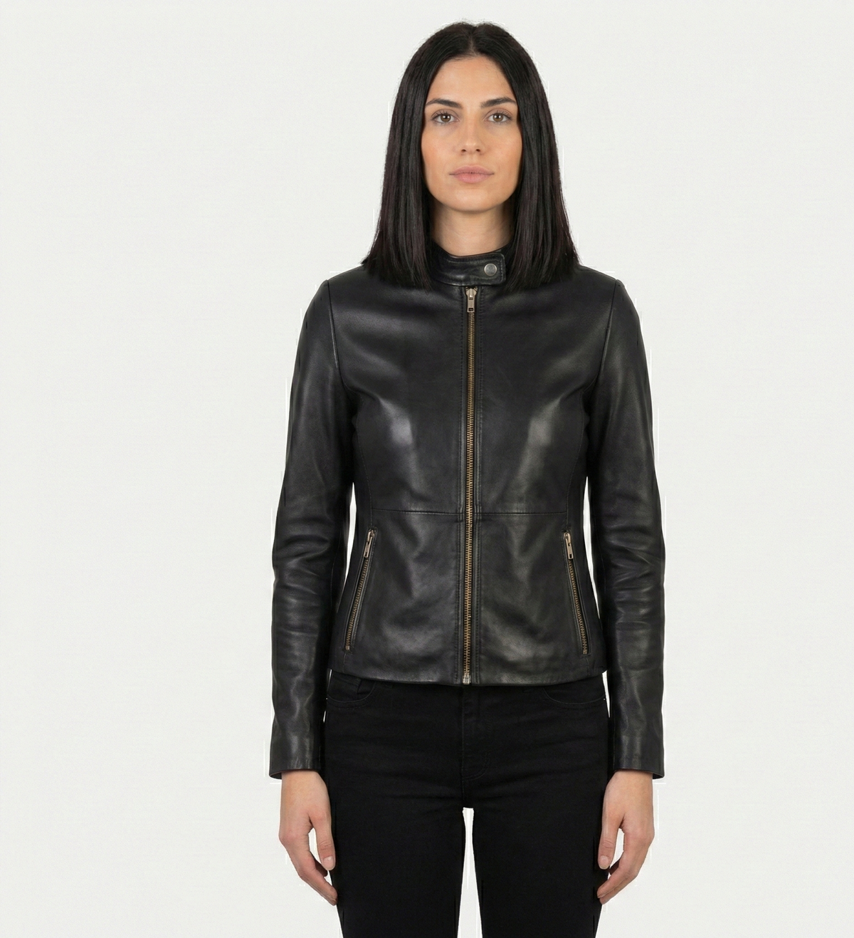 Refined, timeless, and effortlessly versatile, this women’s leather jacket is designed for everyday sophistication. Crafted with a clean silhouette and a sleek stand collar, it delivers a modern take on a classic essential.