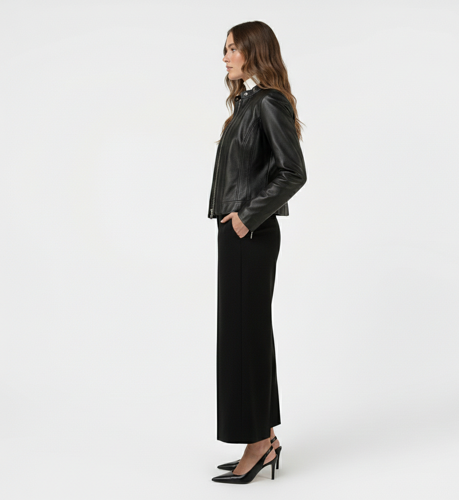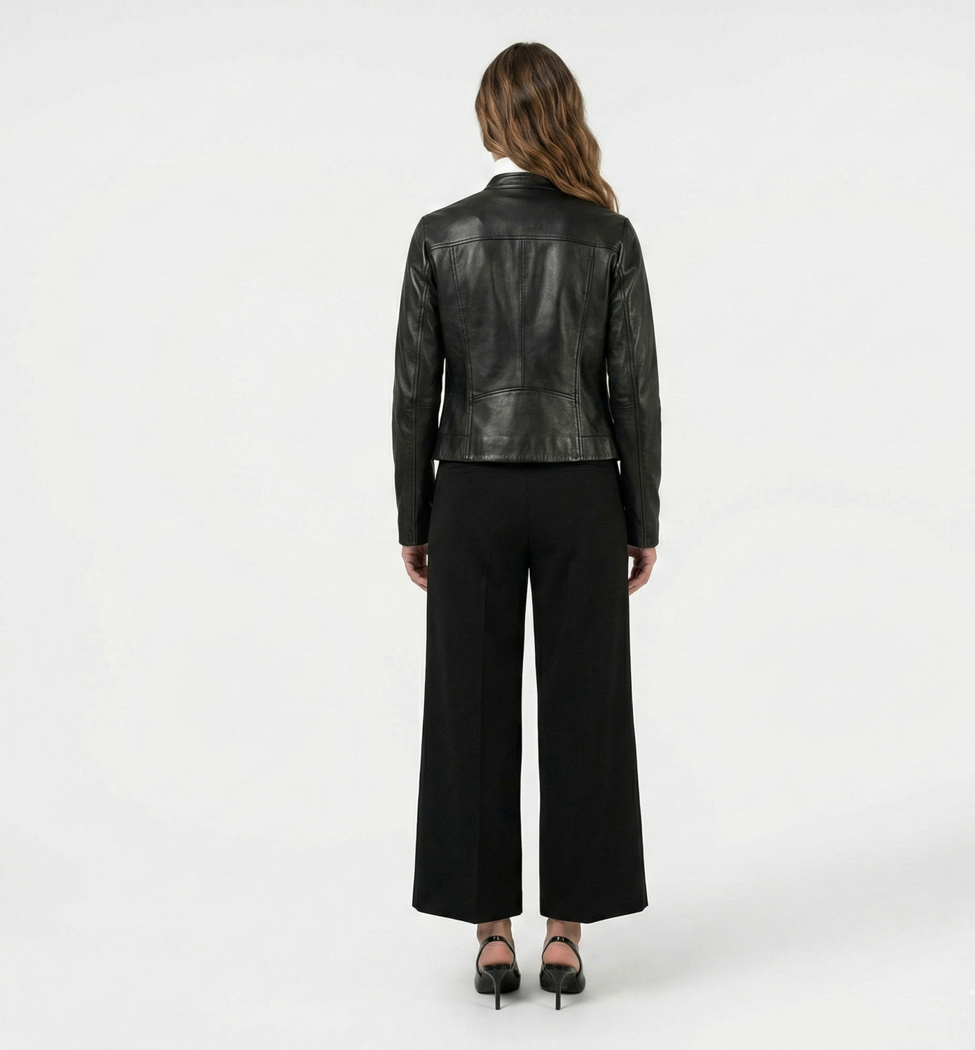 Elevate your everyday wardrobe with this women’s black leather jacket, designed for a refined, modern silhouette. Crafted from premium leather, this jacket features a clean zip-front closure and a streamlined collar that delivers effortless sophistication