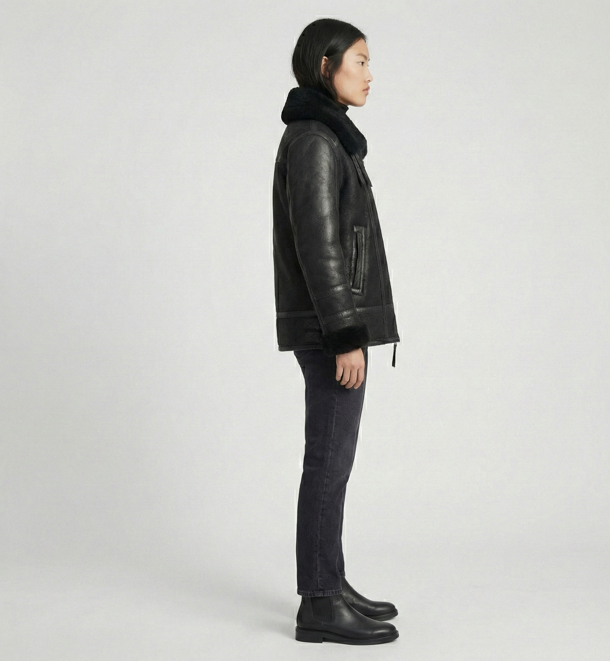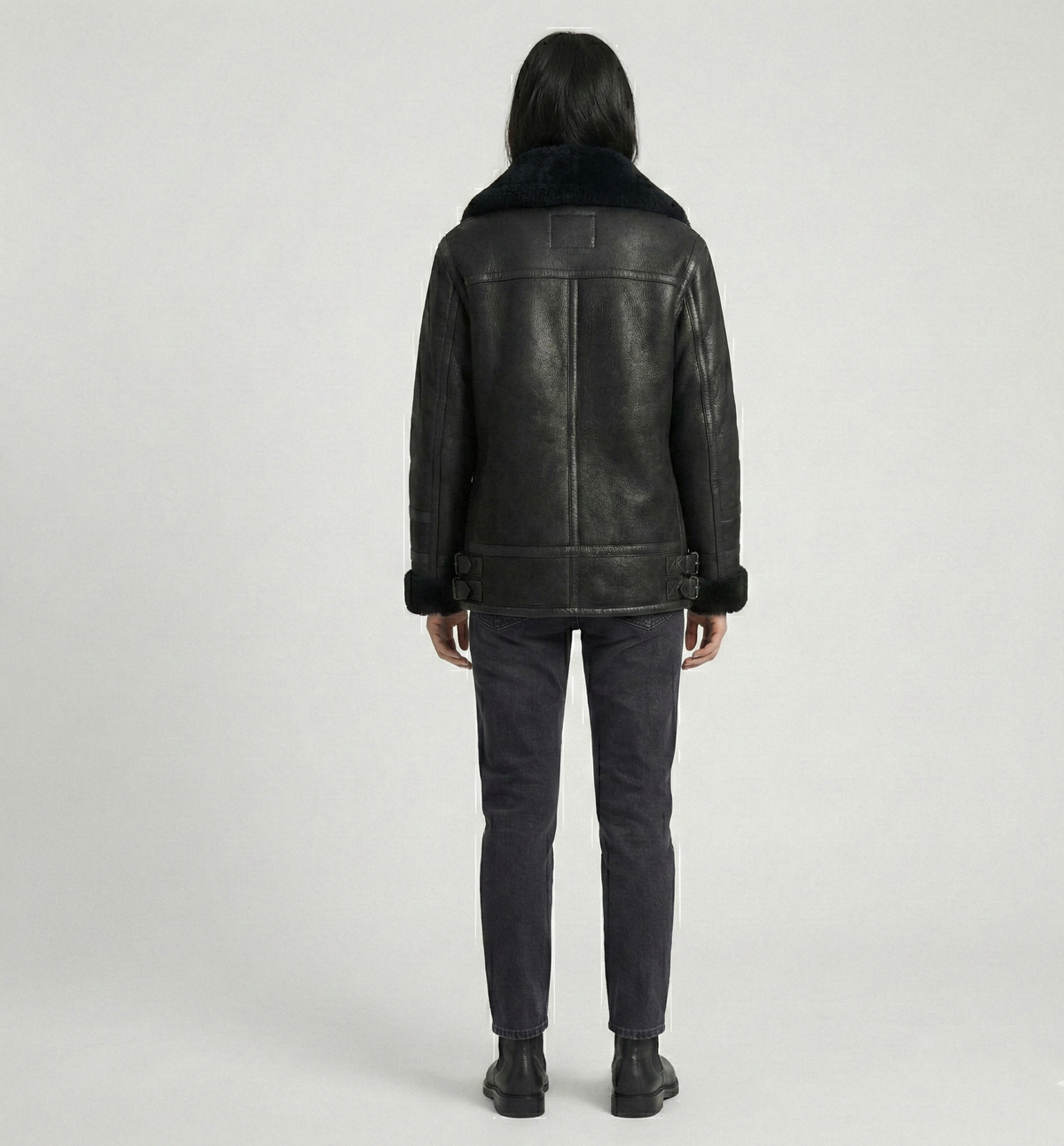 This jacket combines cold-weather performance with a timeless, fashion-forward design. Perfect for customers searching for a warm black shearling jacket, aviator coat, or winter biker-style outerwear.