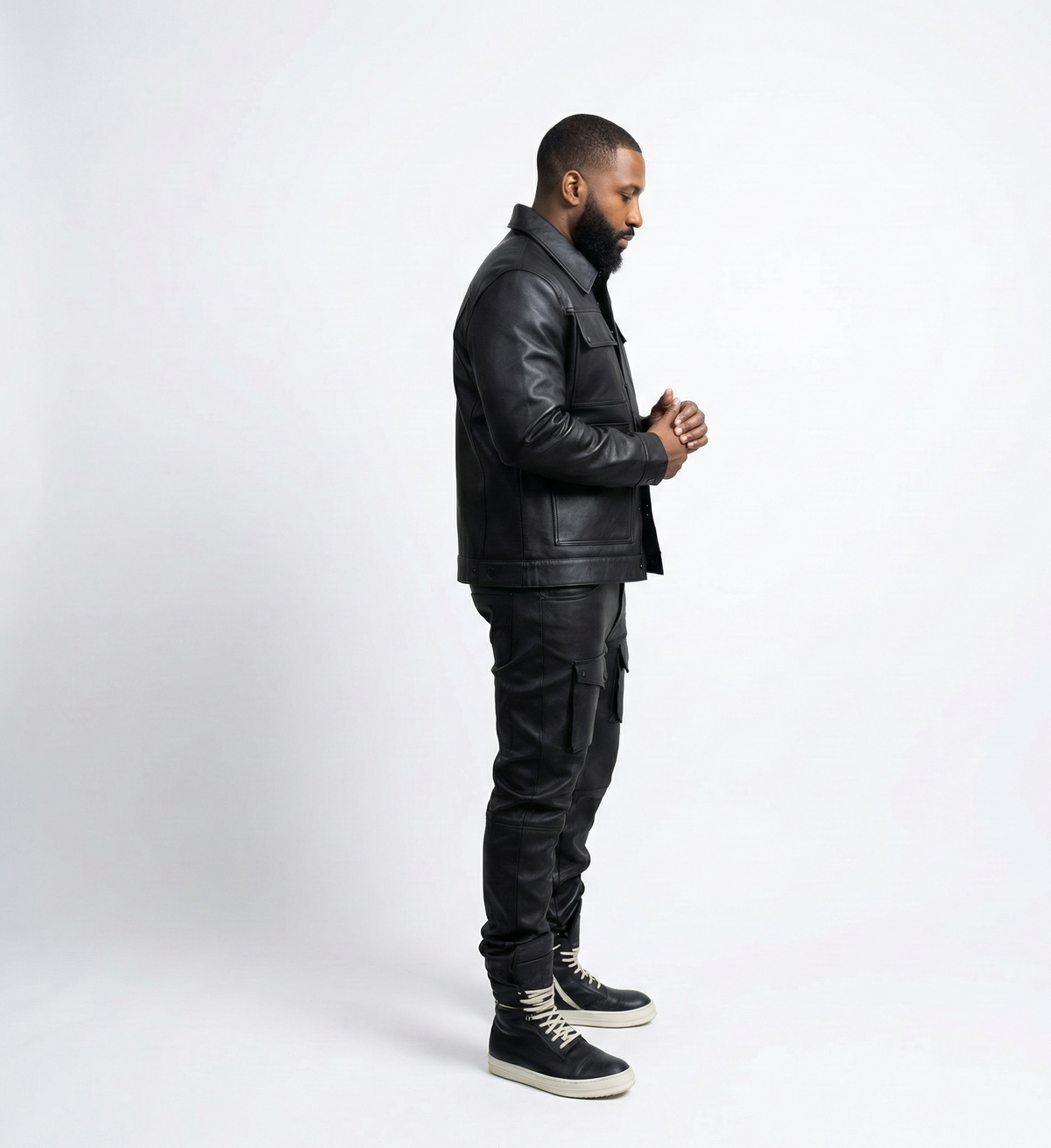 Men’s Black Leather Jacket & Cargo Pants Set – Two-Piece Outfit