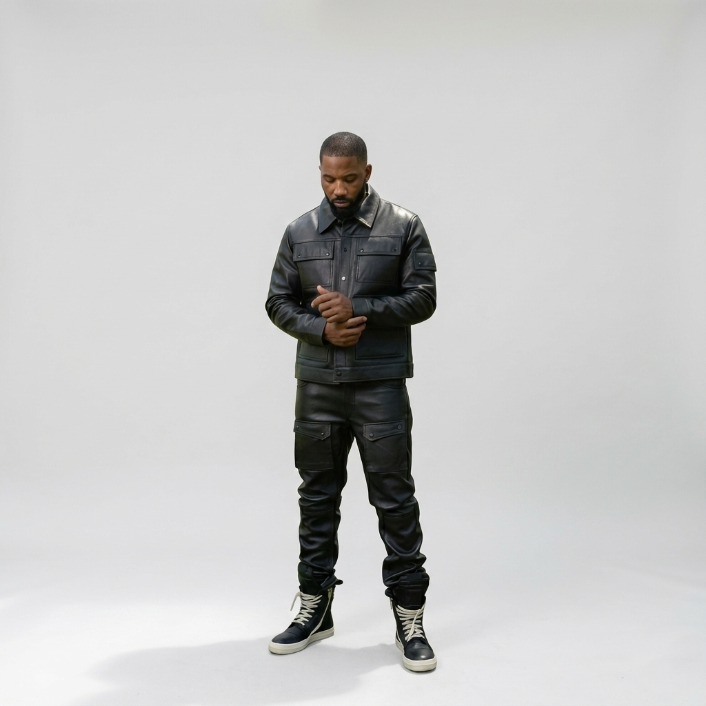 This men’s two-piece outfit features a button-up black leather jacket paired with matching cargo-style leather pants. Designed with a structured yet comfortable fit, it delivers a sharp streetwear look that works for casual wear, lifestyle styling, or standout everyday outfits.