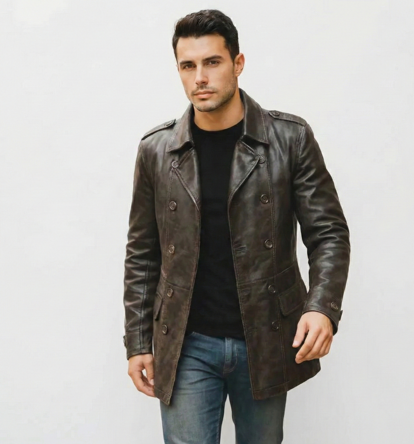 Make a confident statement with this men’s distressed leather trench coat, designed for timeless appeal with a modern edge. Crafted from rich, textured leather, this coat blends rugged character with refined tailoring—perfect for effortless everyday style..