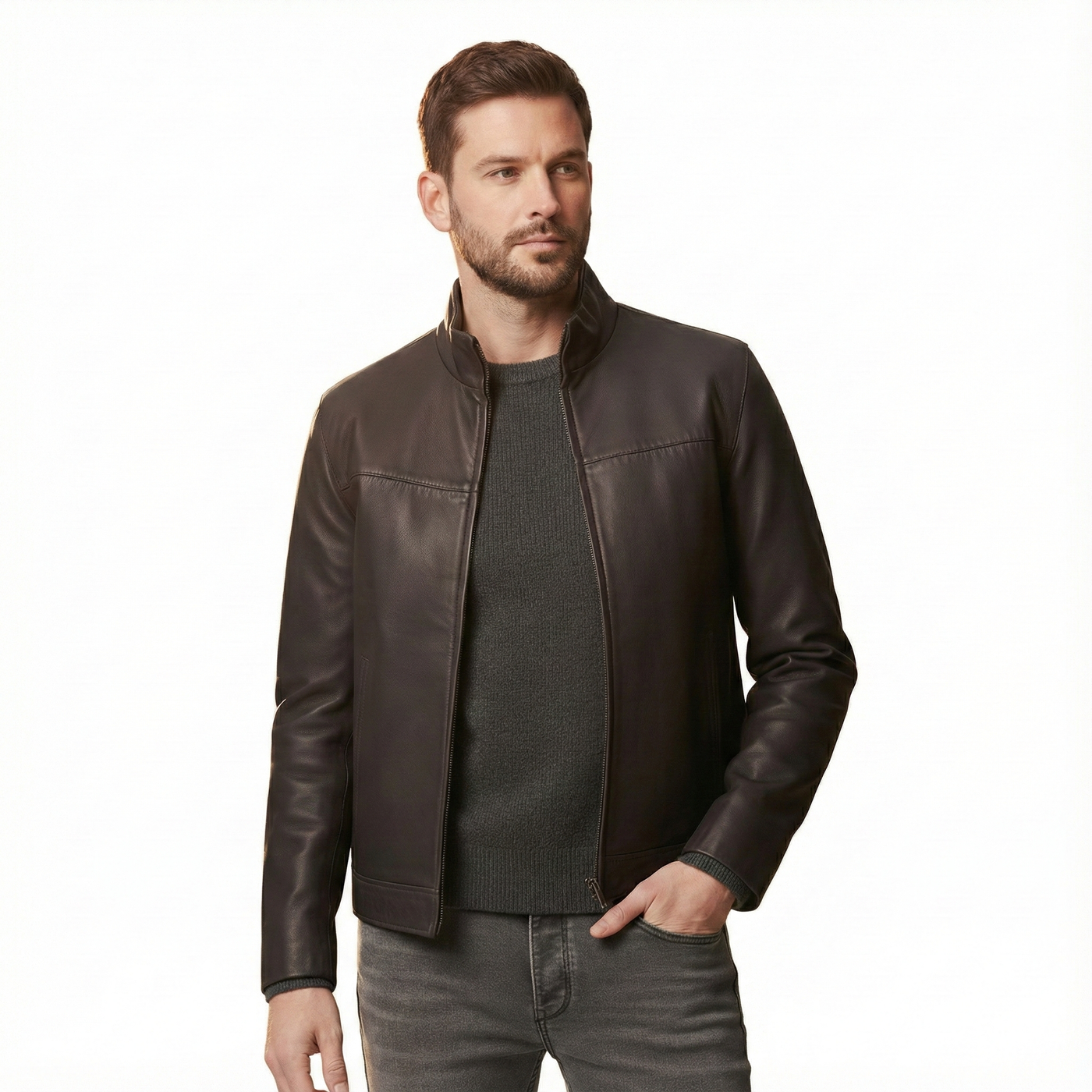 Men’s Brown Leather Jacket with Stand Collar