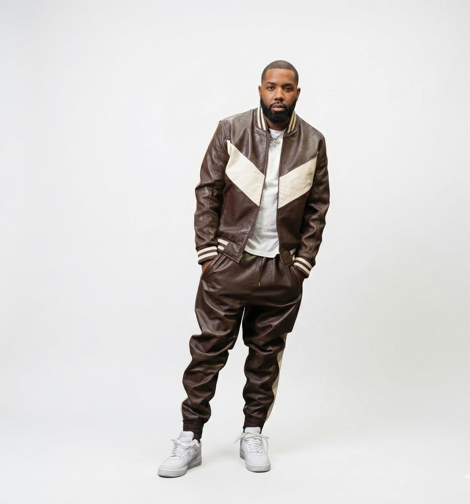 Make a bold statement with this men’s leather track set, designed to blend luxury streetwear with everyday comfort. Featuring a rich brown leather-look finish and contrast chevron detailing, this matching set delivers a modern, elevated aesthetic perfect for casual wear or stepping out in style.