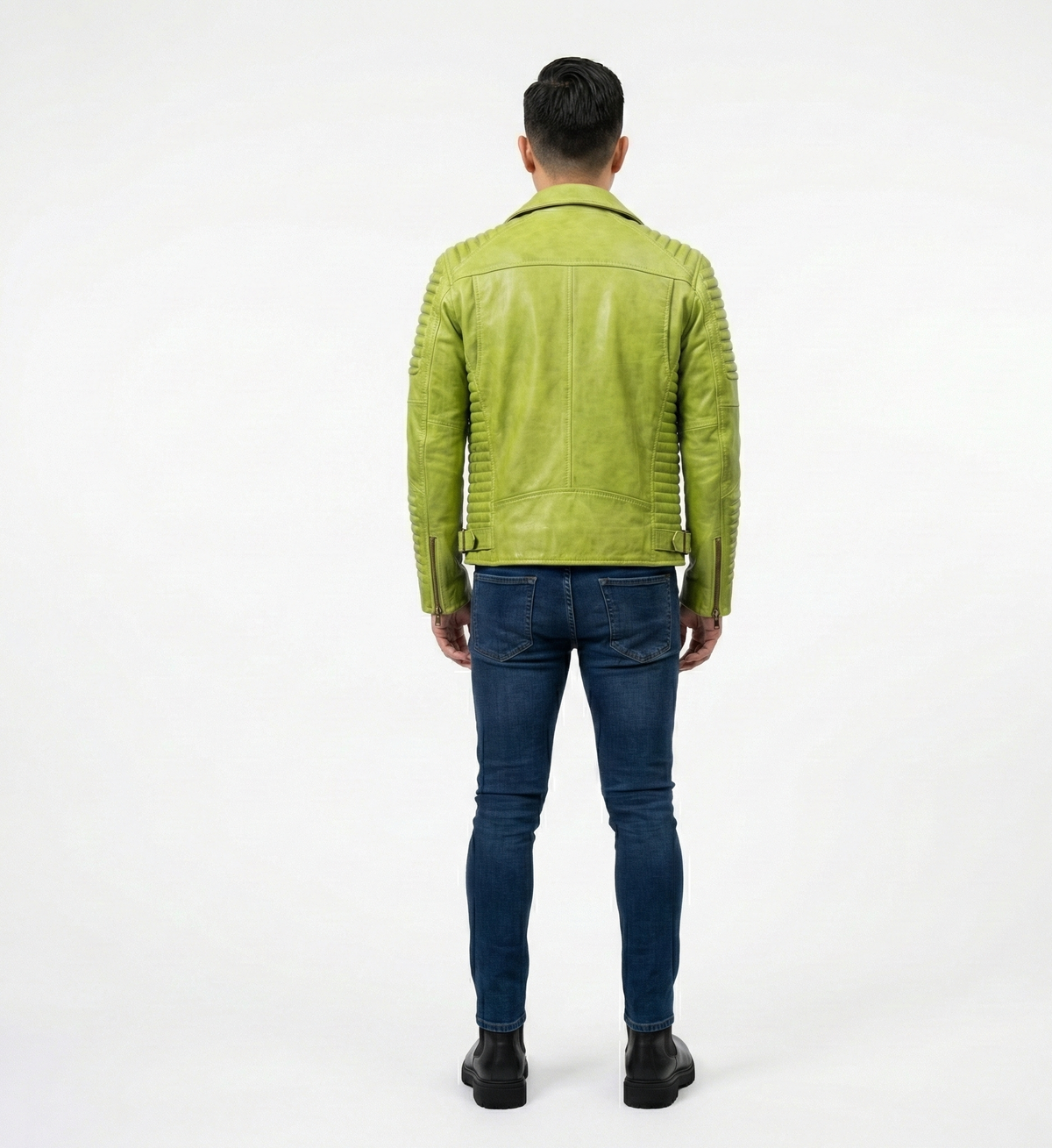 Men’s Green Leather Moto Jacket with Ribbed Sleeves – Contemporary Biker Fashion