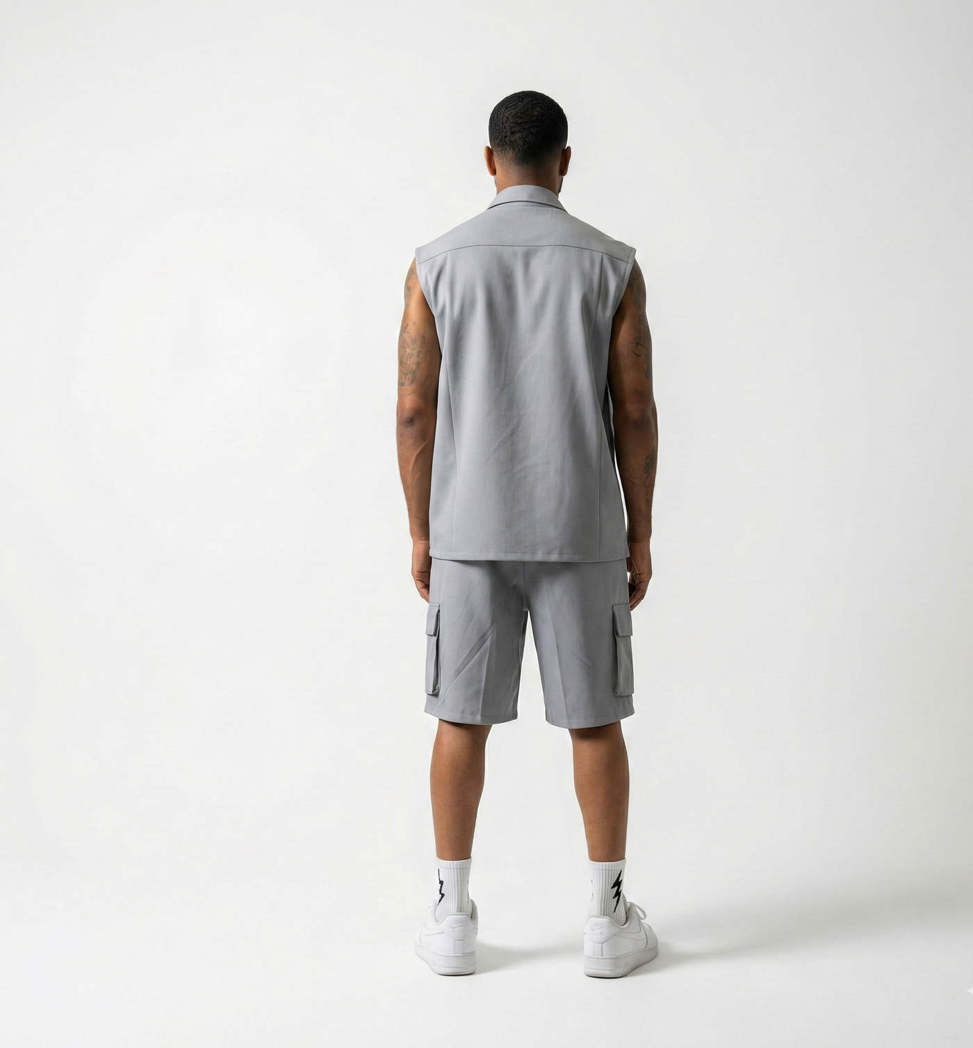 Pair with the matching gray utility vest or sleeveless shirt for a streamlined streetwear set, or style with a white tee and sneakers for a clean everyday look.
