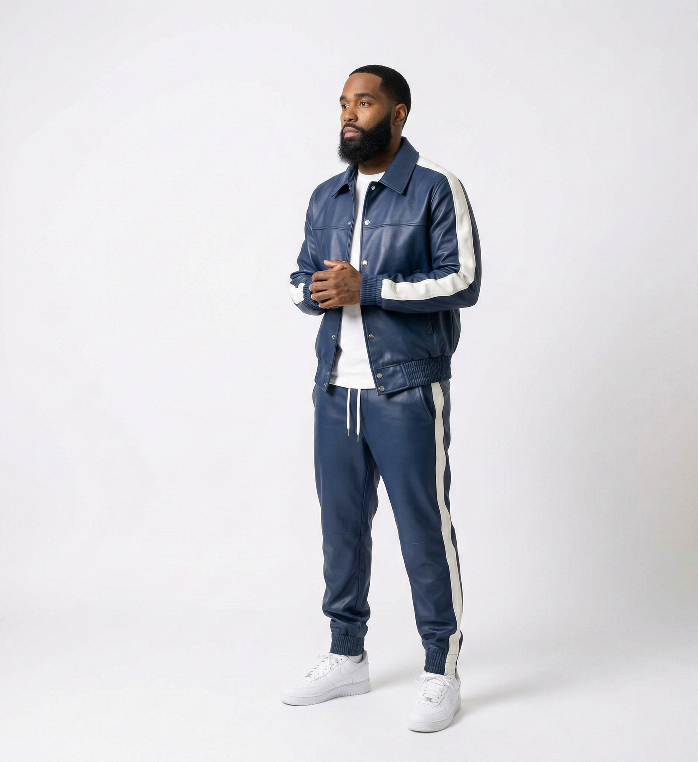 Upgrade your streetwear rotation with this men’s navy leather jacket and jogger set, designed for a clean, modern look with premium appeal. This two-piece outfit blends structured tailoring with relaxed comfort, making it perfect for everyday wear, travel, or elevated casual styling..