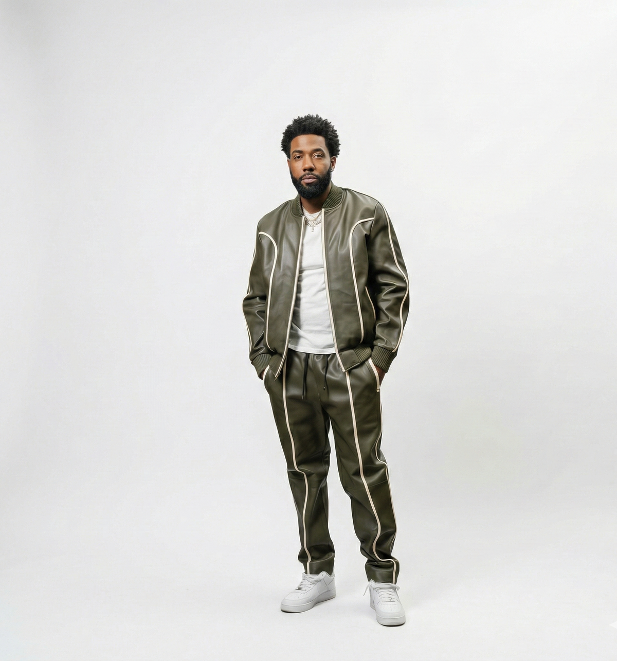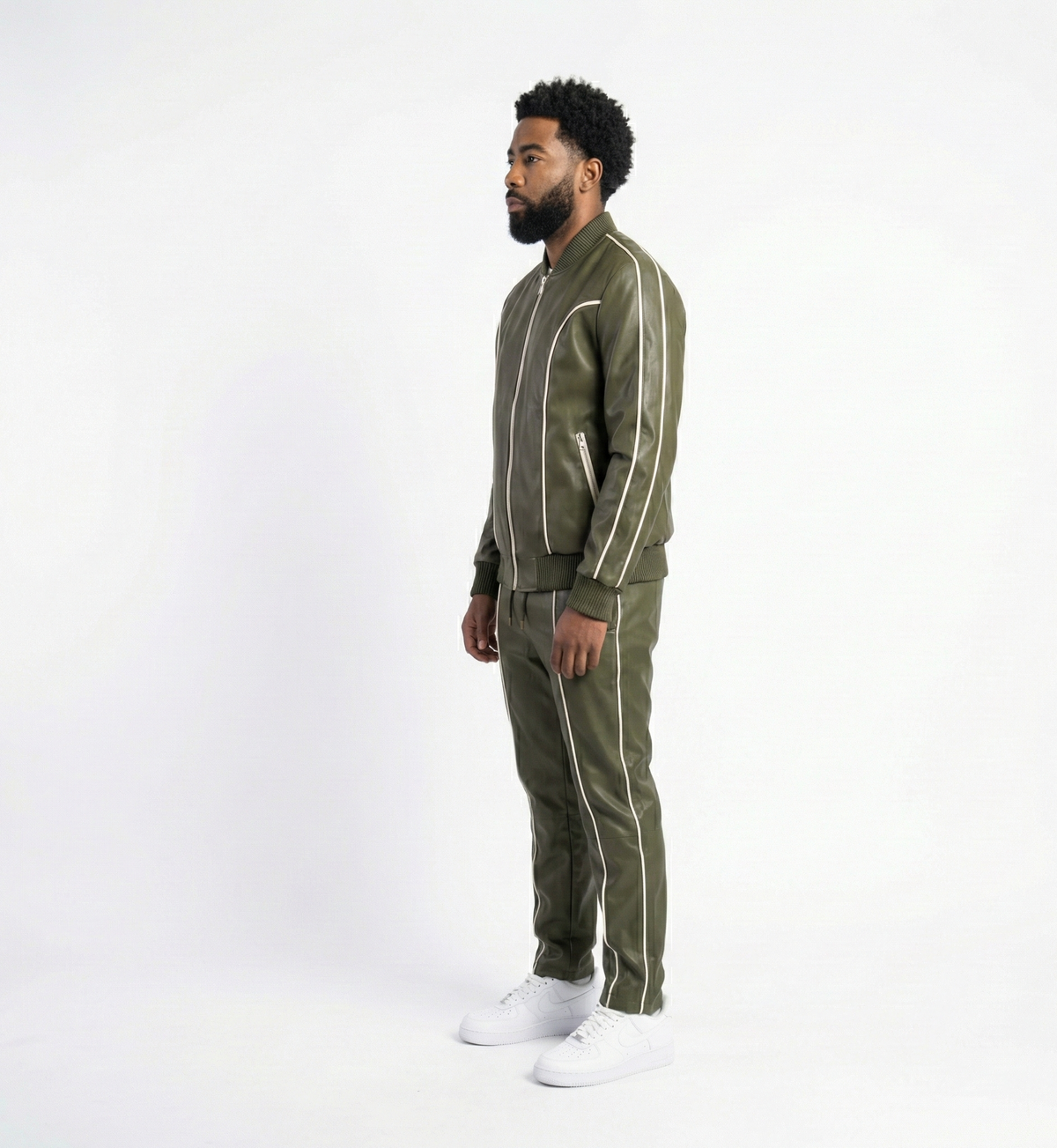 men’s olive leather jacket and jogger set, designed for a sleek, modern streetwear look. Crafted with a smooth leather finish and contrast piping details, this two-piece set delivers a bold yet refined aesthetic that stands out effortlessly.