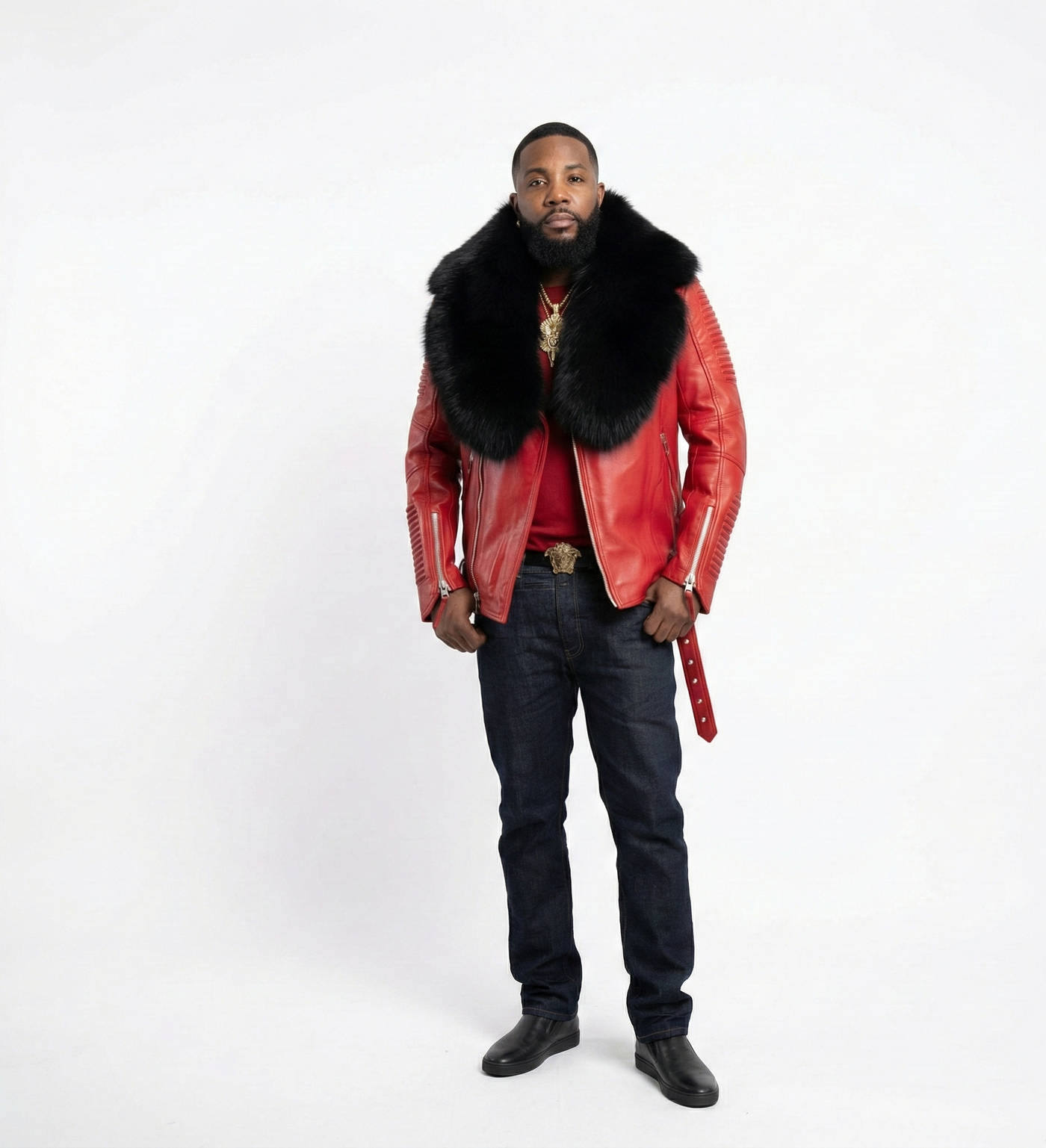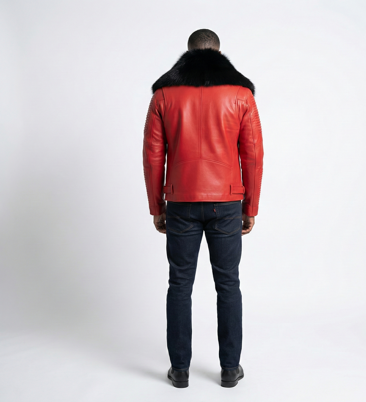 Men’s Red Leather Jacket featuring a Bold Black Fur Collar. Designed for statement-makers, this jacket blends luxury streetwear aesthetics with premium craftsmanship for a powerful, confident look.