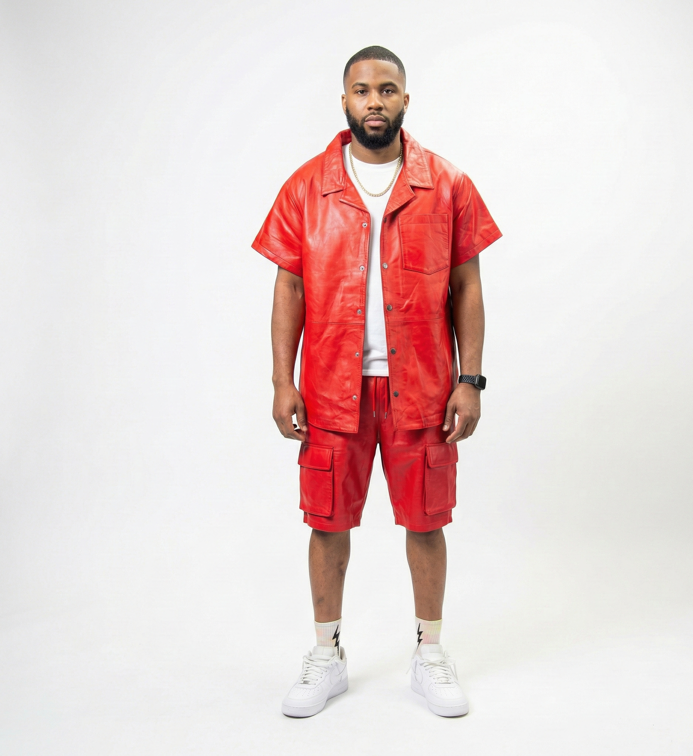 Men’s Red Leather Streetwear Set with Cargo Shorts