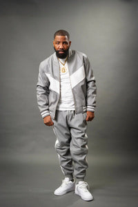 Men's V-Baseball Leather Track Suit Sweatsuit [Grey/White] - XS / 28
