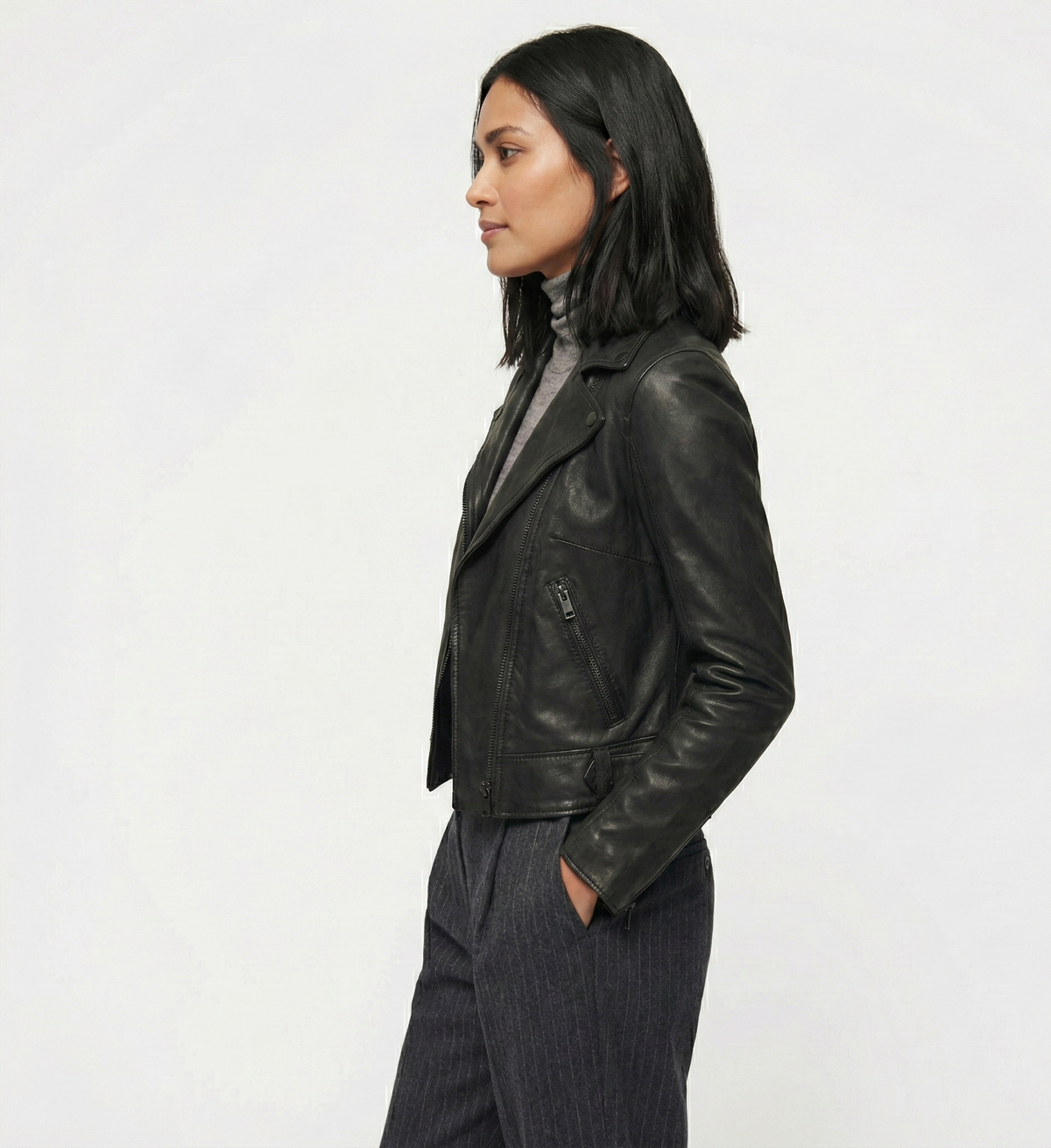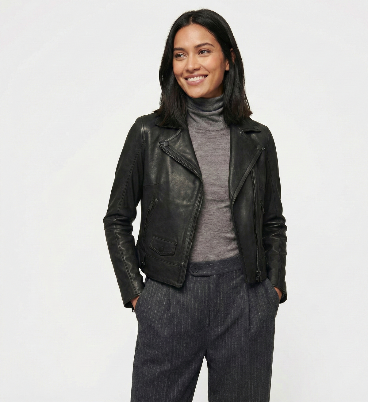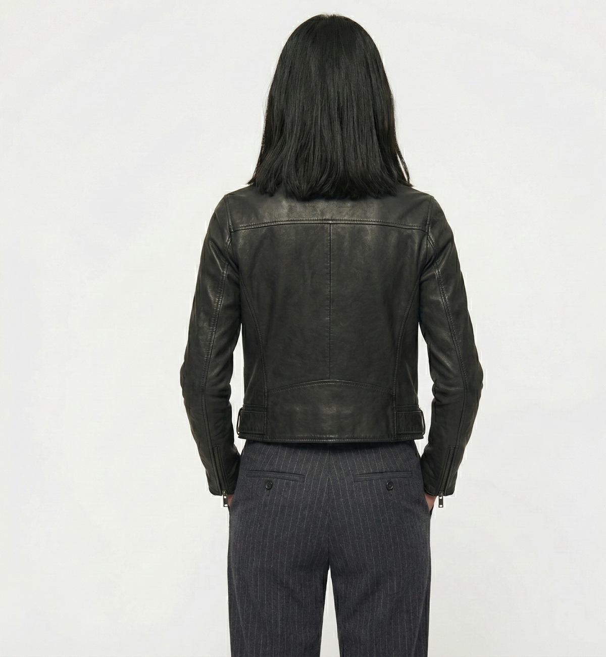 Crafted from premium genuine leather, it features a classic biker silhouette with an asymmetrical zip front, structured lapel collar. Designed to transition seamlessly from day to night, this versatile black leather jacket pairs perfectly with denim, tailored trousers, or dresses.