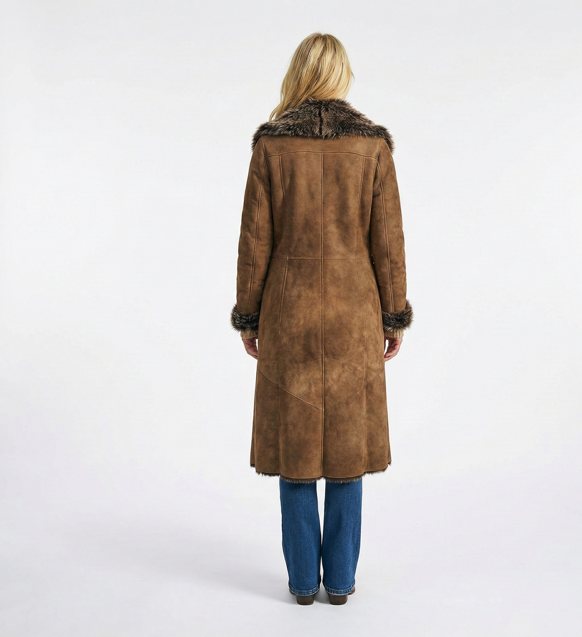Women’s Brown Shearling Trim Mid-Length Winter Coat