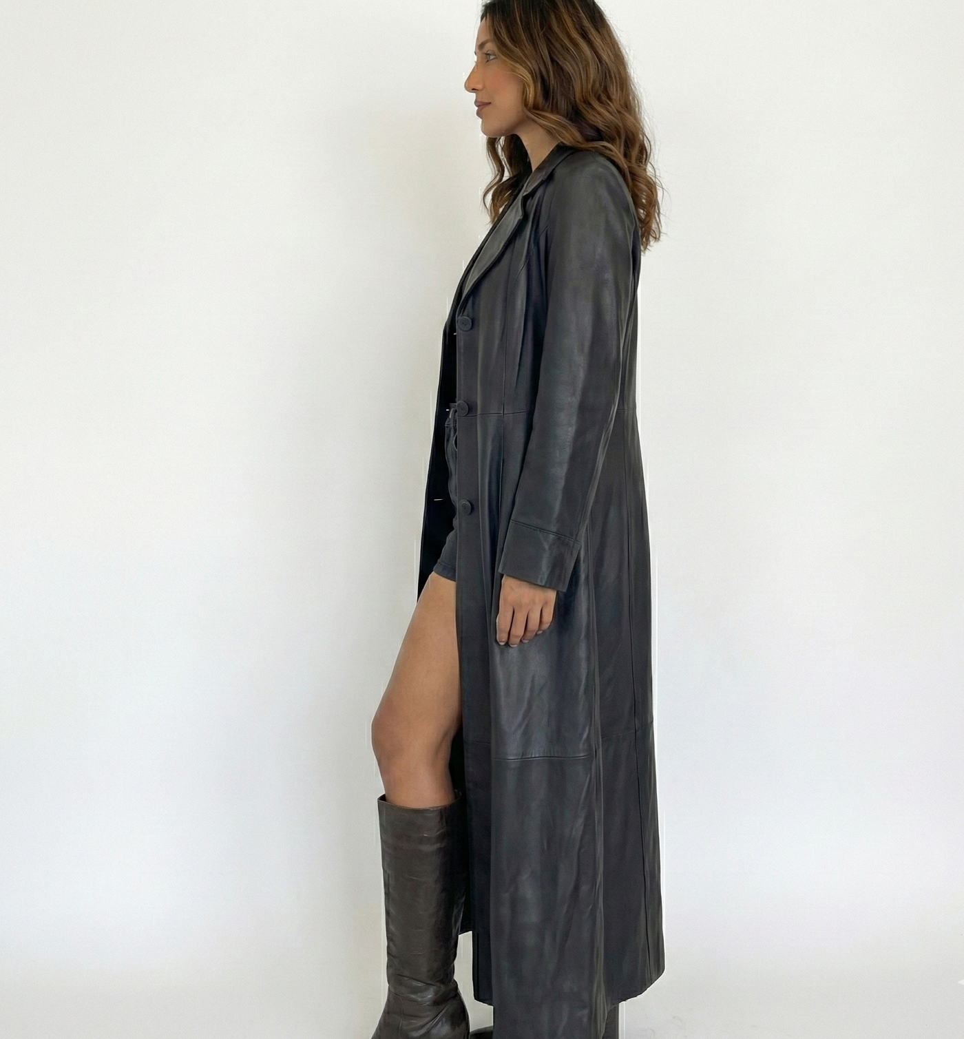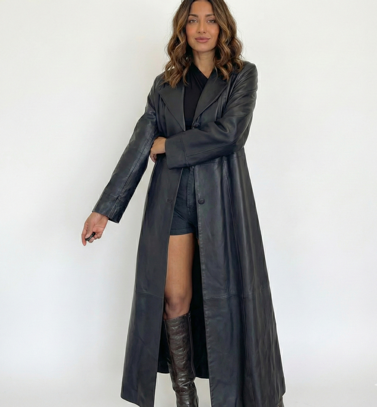 Make a bold, timeless statement with this long black leather trench coat, designed to elevate any modern wardrobe. Crafted from premium leather with a smooth matte finish, this longline trench combines classic tailoring with a confident, contemporary edge.